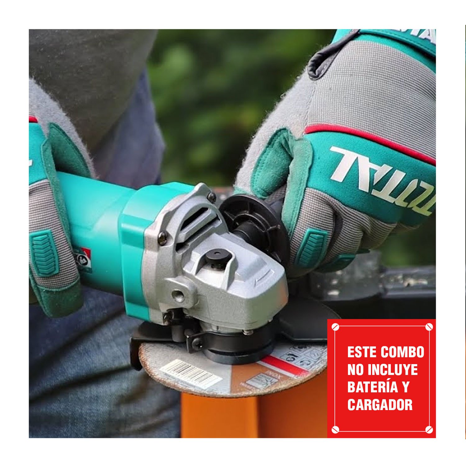 ESTE COMBO COMPLETO INCLUYE; 1 AMOLADORA 20V 4 1/2; 1 DISCO DE CORTE METAL; 1 PAR DE GUANTES ANTI CORTE XL.