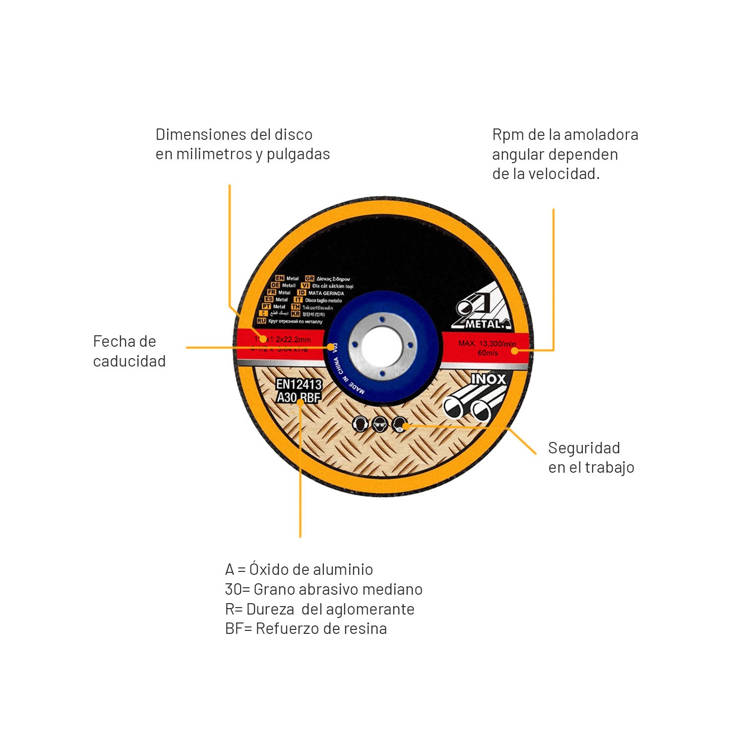 - Medidas : 115 MM (4 / 1/2 ") x 1.2MM (3/64") x 22.2MM (7/8 ")