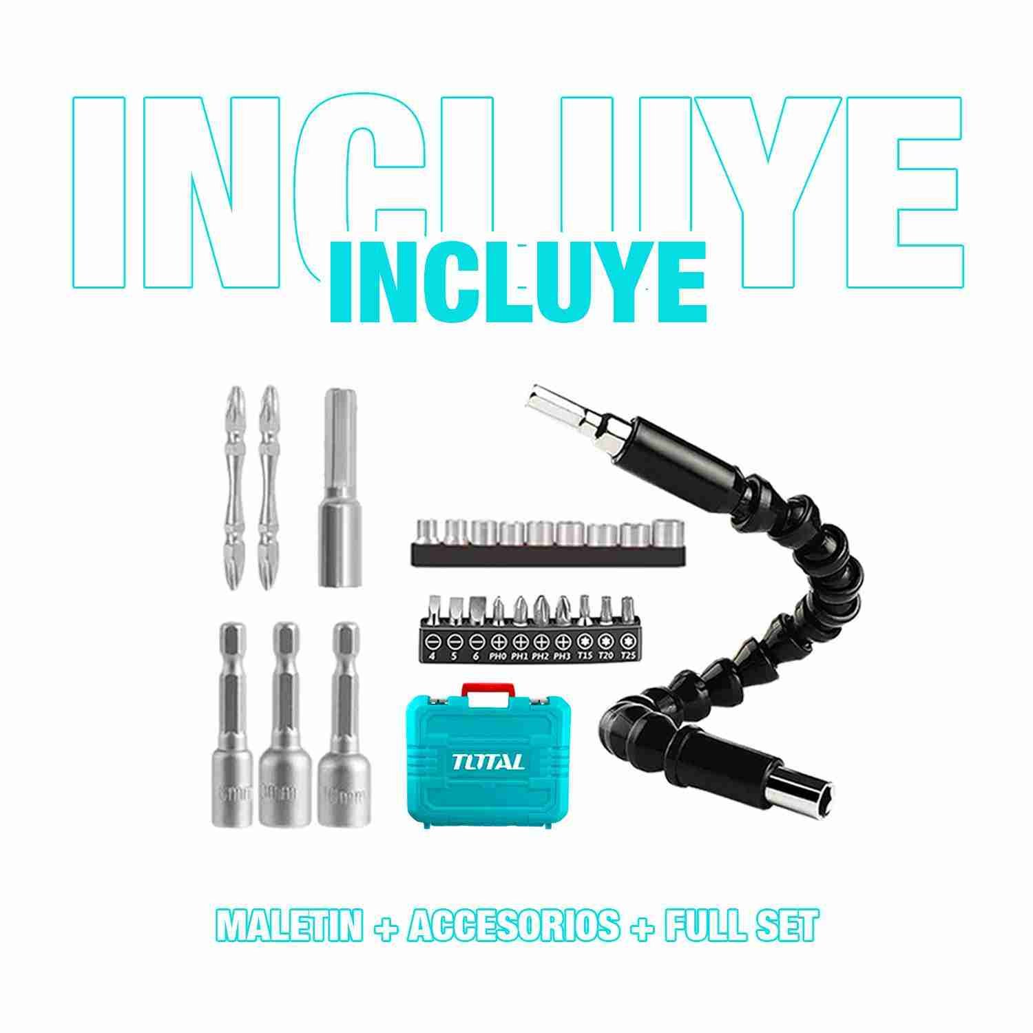 ESTE COMBO INCLUYE: 1 ATORNILLADOR DE IMPACTO + 2 PUNTAS DE DESTORNILLADOR + 3 PIEZAS DE TUERCAS + FULLSET + MALETIN DE TRASPORTE