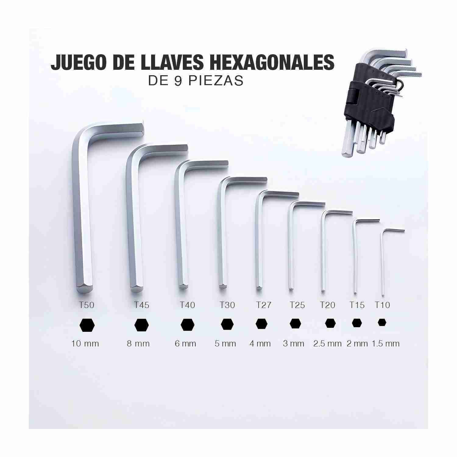 - Juego de llaves hexagonales de acero al cromo vanadio con acabado materia.