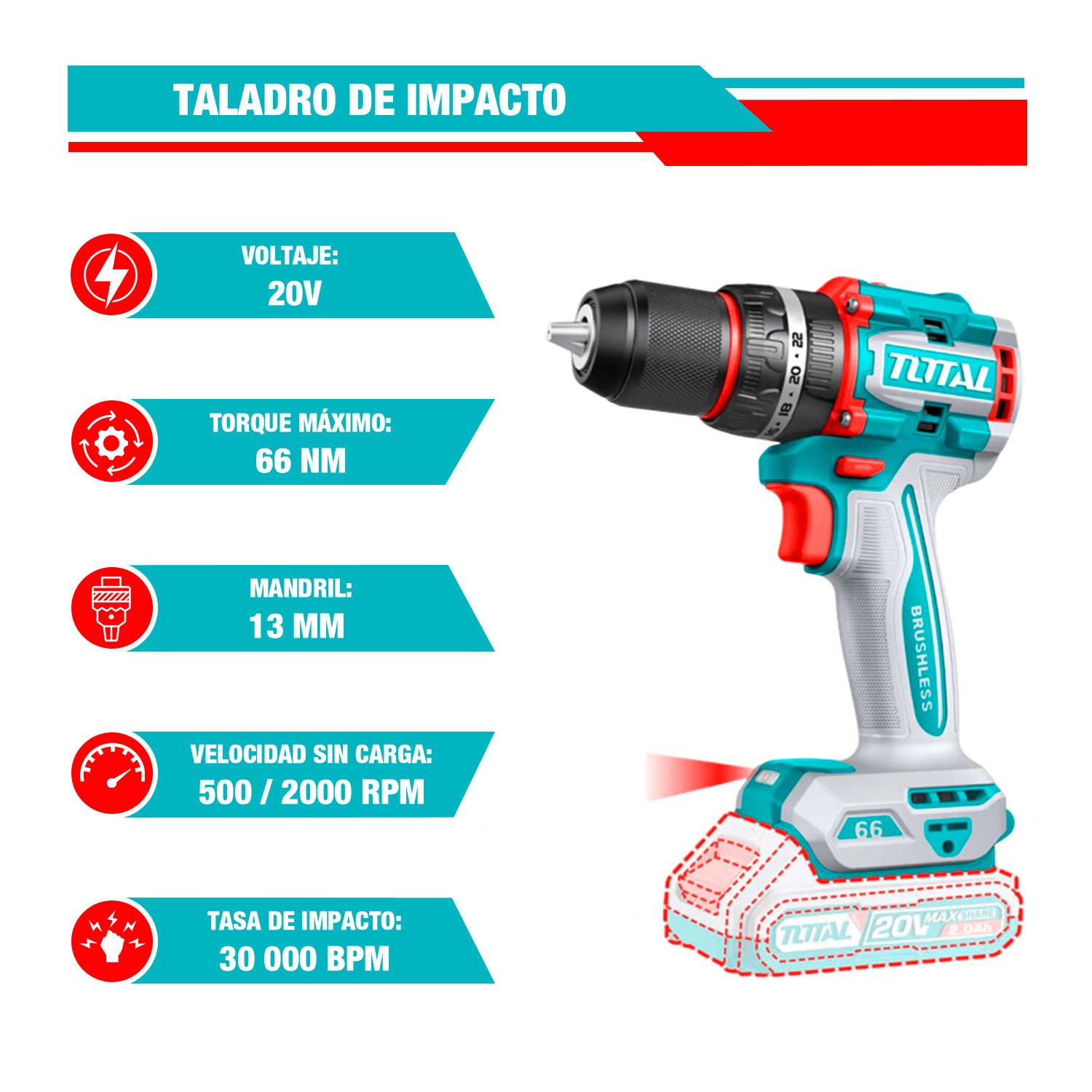 -Drill Taladro 1/2'' 20V 66Nm de impacto. (Sin escobillas).
