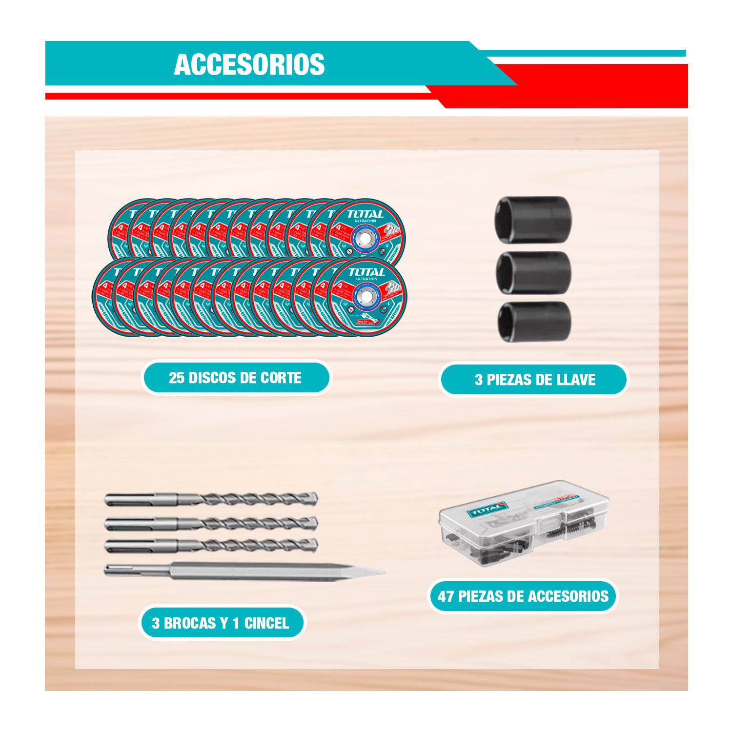 ESTE COMBO COMPLETO INCLUYE; 1 LLAVE DE IMPACTO; 1 TALADRO DE IMPACTO; 1 ROTOMARTILLO; 1 AMOLADORA ANGULAR; 1 LINTERNA DE TRABAJO; 3 DADOS; 3 BROCAS; 1 CINCEL; 25 DISCO DE CORTE; 47 ACCESORIOS;1 PORTAHERRAMIENTA; 2 BATERÍAS 4.0 Ah; 1 CARGADOR.