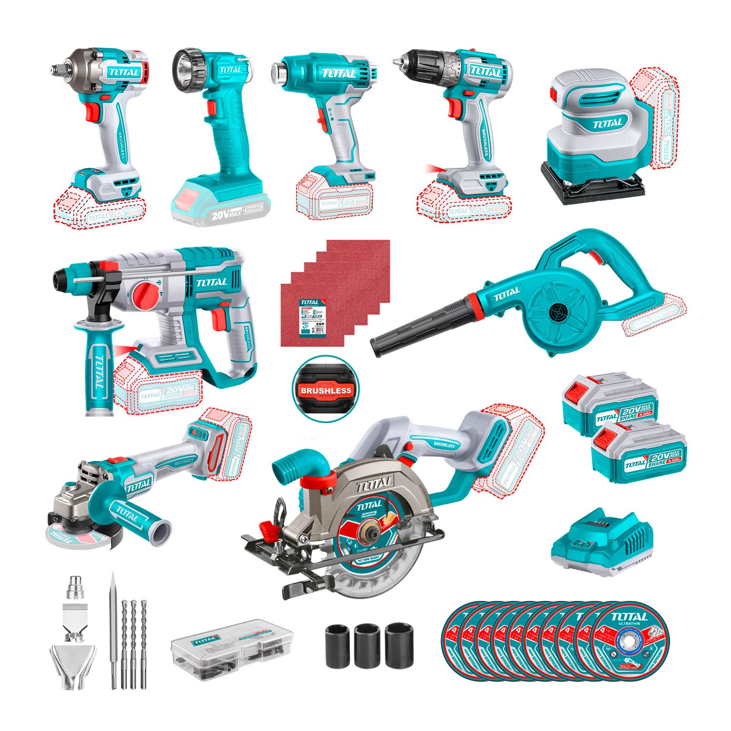ESTE COMBO COMPLETO INCLUYE; 1 SIERRA CIRCULAR; 1 ROTOMARTILLO; 1 AMOLADORA ANGULAR; 1 TALADRO ATORNILLADOR; 1 LIJADORA DE BANDA; 1 PISTOLA DE CALOR; 1 LÁMPARA LED; 1 SOPLADOR ; 1 LLAVE DE IMPACTO; 2 BATERÍA 4.0AH; 1 CARGADOR 20V; 3 BROCAS; 1 CINCEL; 5 HOJAS DE LIJA; 10 DISCOS DE CORTE; 1 HOJA DE SIERRA 140MM; 1 BOQUILLA REDUCTORA, REFLECTORA, PLANA; 3 DADOS DE IMPACTO