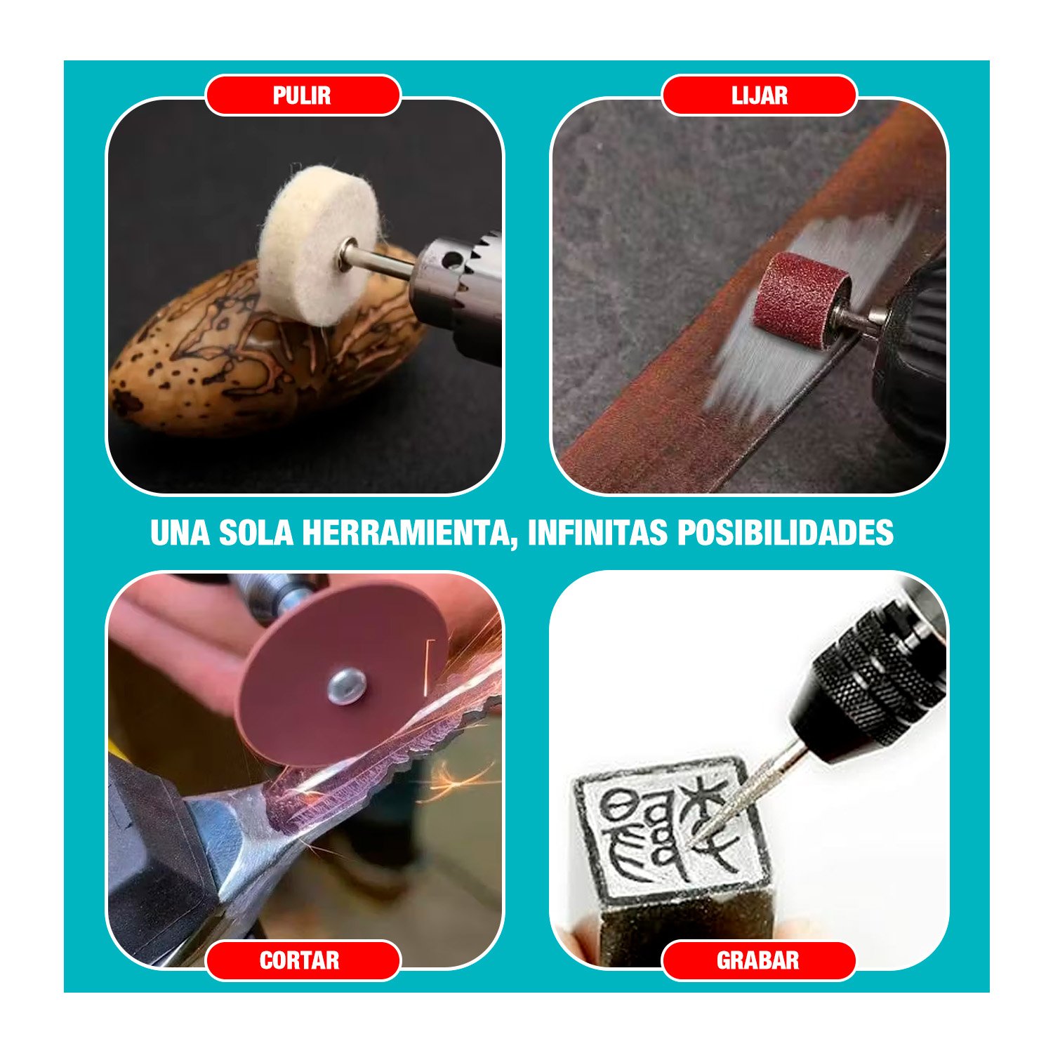 ESTE COMBO COMPLETO INCLUYE; 1 GRINDER; 529 ACCESORIOS PARA GRINDER; 1 EJE FLEXIBLE.