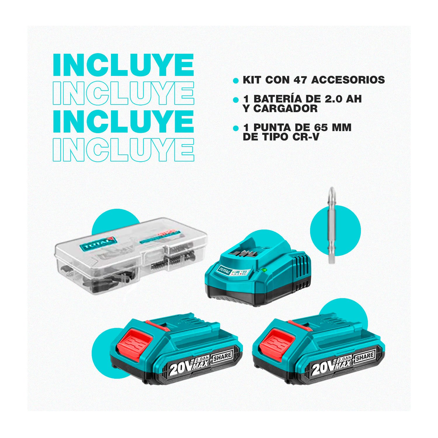 ESTE COMBO INCLUYE: 1 TALADRO COMPACTO 55NM + 1 TALADRO INALAMBRICO 52NM + 1 BATERÍA 2.0AH + 1 CARGADOR + SET DE 47 ACCESORIOS + 1 PUNTA DE 65MM TIPO CR.V