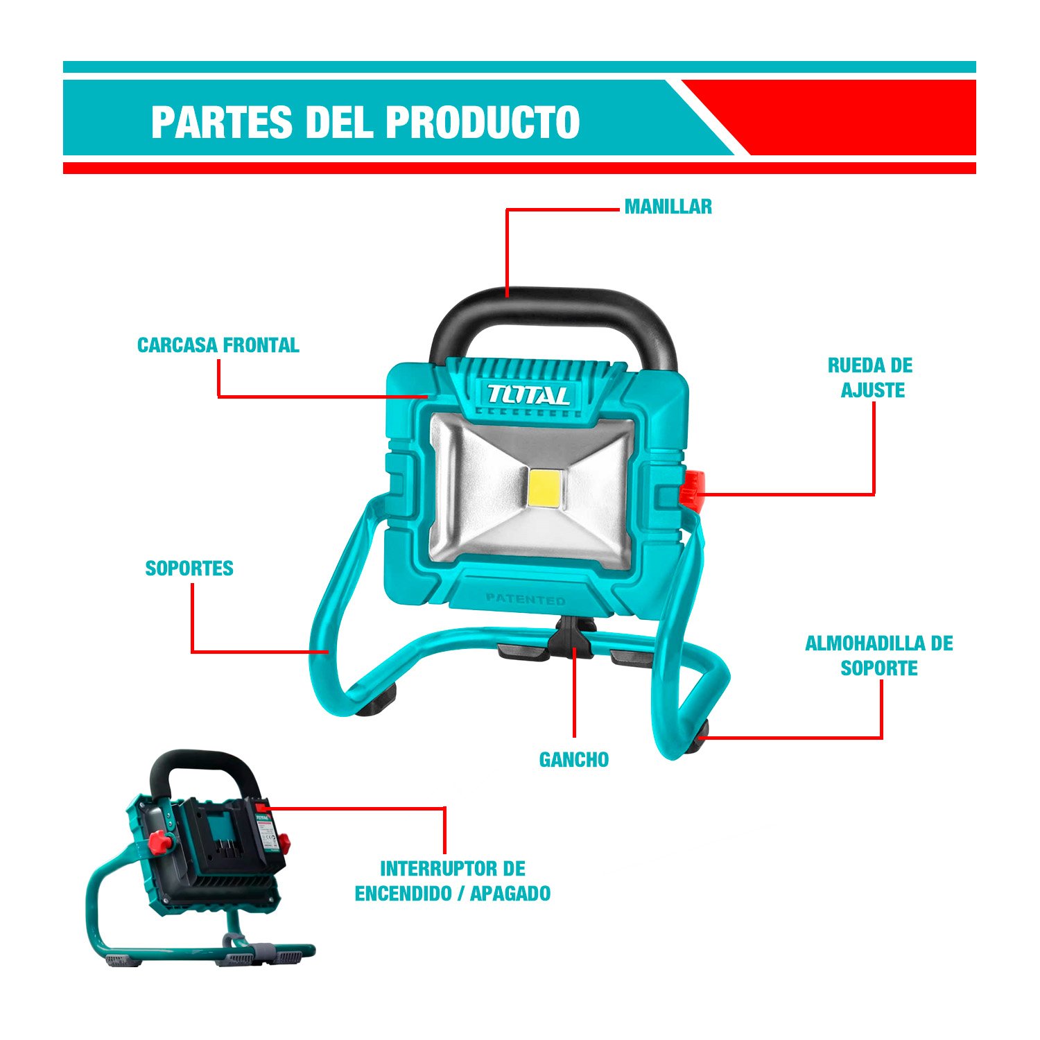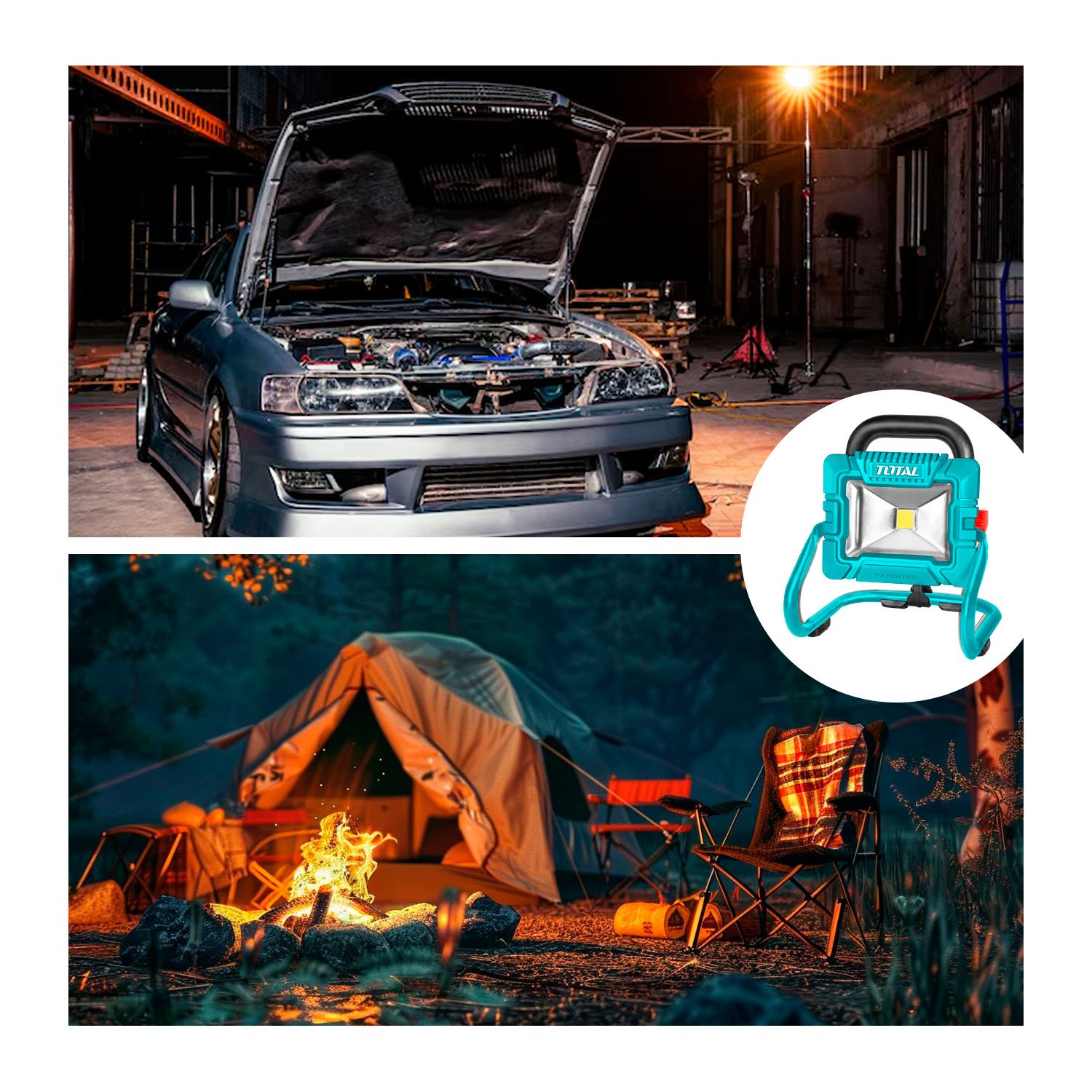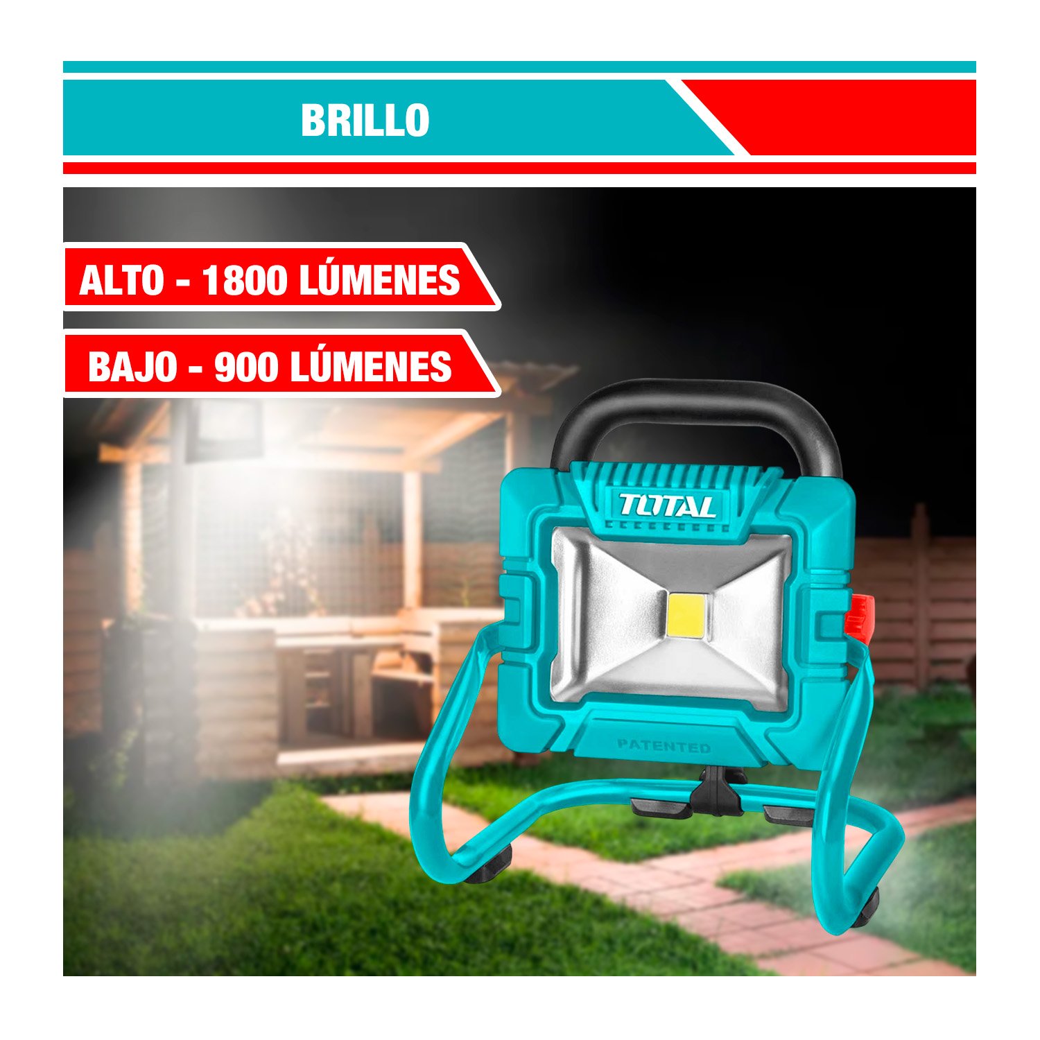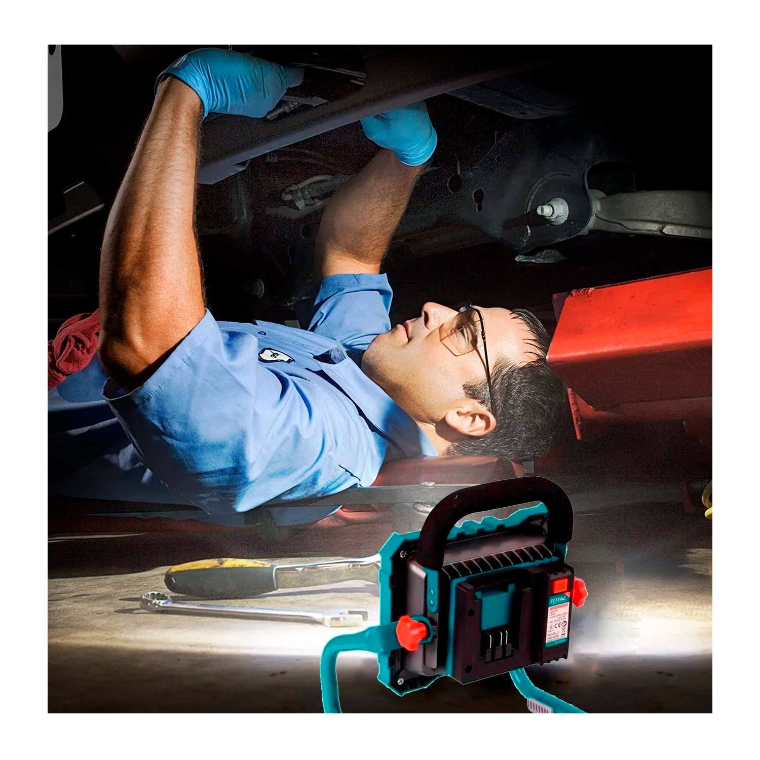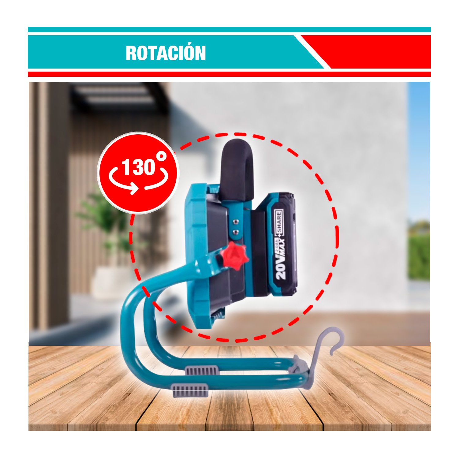 Lámpara portátil LED de 20V y 1800 lúmenes, diseñada para ofrecer una iluminación potente y uniforme en cualquier entorno. Su cabezal ajustable de 130° facilita dirigir la luz según la necesidad, mientras que su diseño resistente y compatible con baterías recargables brinda autonomía, movilidad y seguridad en cada trabajo.