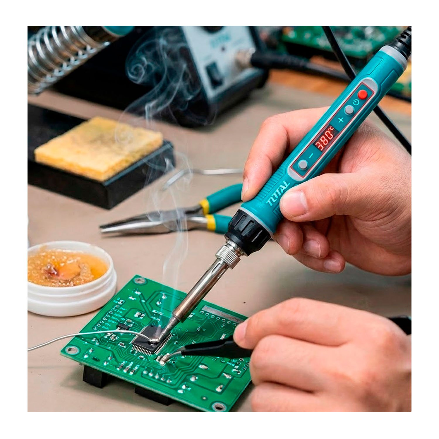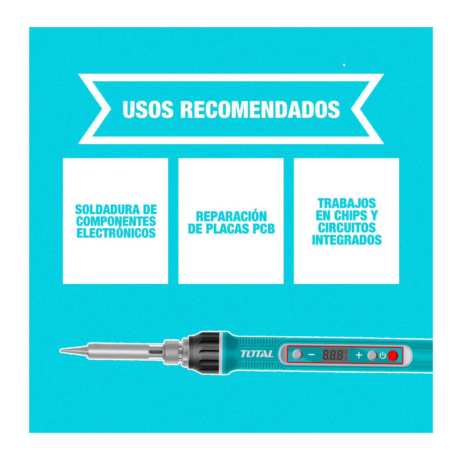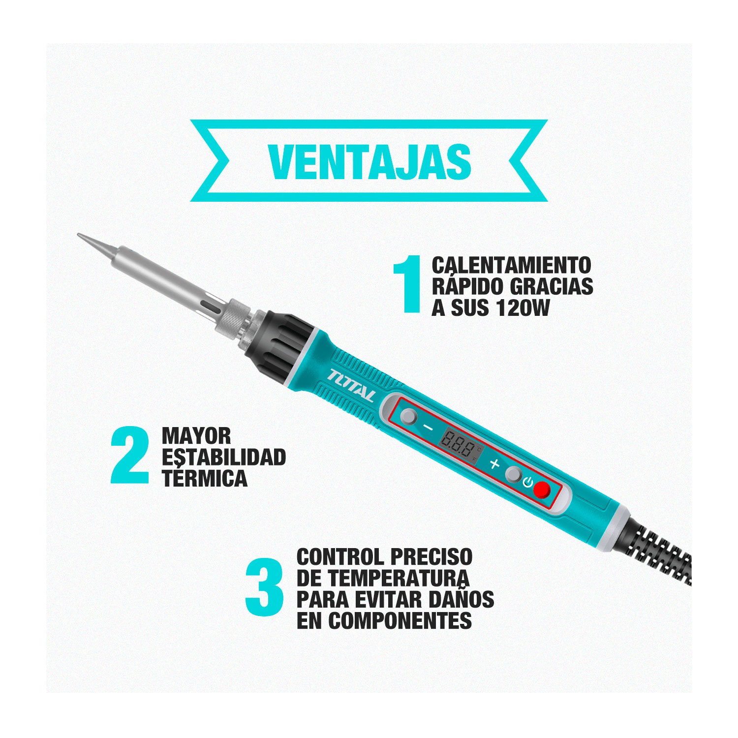 El cautín eléctrico TOTAL TET01606 es una herramienta práctica y confiable para trabajos de soldadura electrónica, mantenimiento y reparaciones. Cuenta con control de temperatura regulable, lo que permite ajustar el calor según el tipo de material y componente, logrando soldaduras más precisas y seguras. Su calentamiento rápido, mango ergonómico resistente al calor y punta metálica intercambiable brindan comodidad, control y durabilidad durante el uso continuo. Es ideal tanto para uso profesional como para proyectos de bricolaje y electrónica en el hogar o taller.
