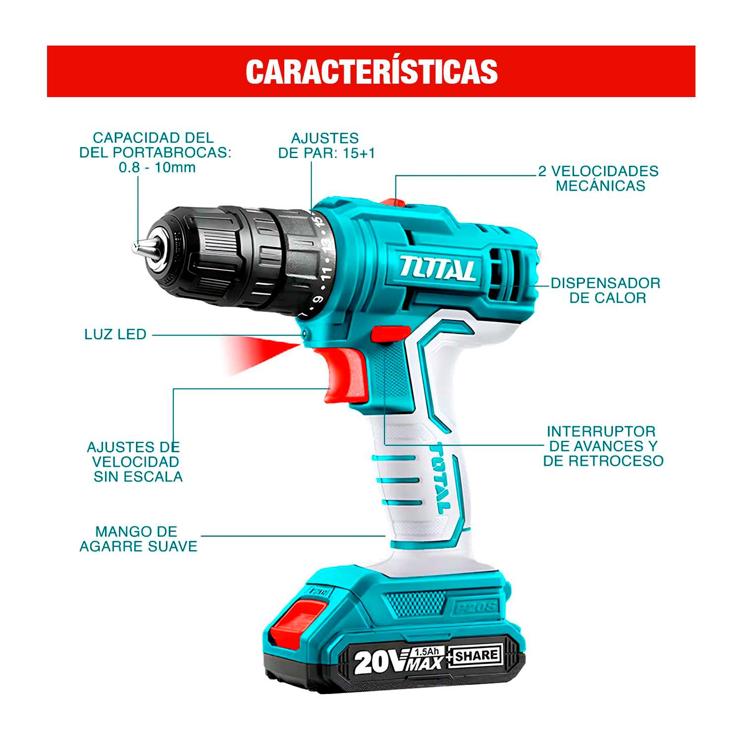 TALADRO ATORNILLADOR INALÁMBRICO 20V 45NM 0.8-10MM - TDLI20011