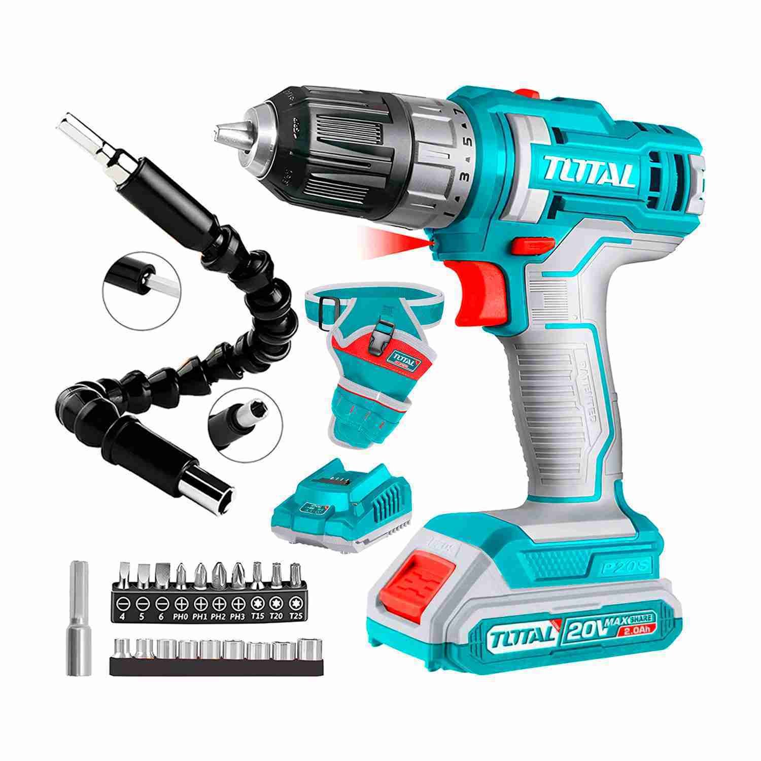 Incluye un potente taladro atornillador inalámbrico de 20V con luz LED, batería, cargador, porta taladro ergonómico con bolsillos múltiples, y un set de 21 accesorios con eje flexible, puntas, dados y adaptadores para llegar a cualquier rincón. Todo lo que necesitas, en un solo kit.