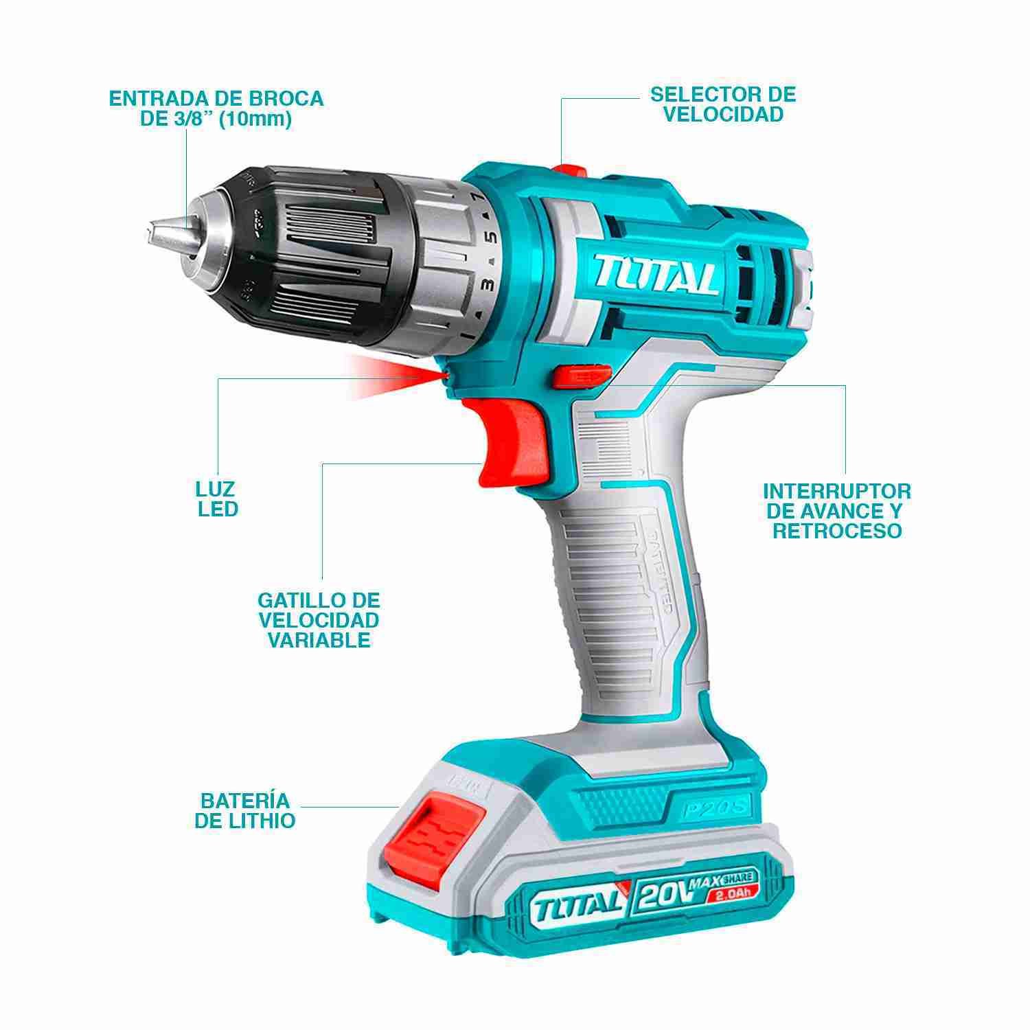 EL COMBO ENTERO INCLUYE: 1 TALADRO 3/8 ; 1 BATERÍA DE 20V 2,0 Ah; 1 CARGADOR; 1 PORTA TALADRO; 21 ACCESORIOS PARA TALADRO; EXTENSOR