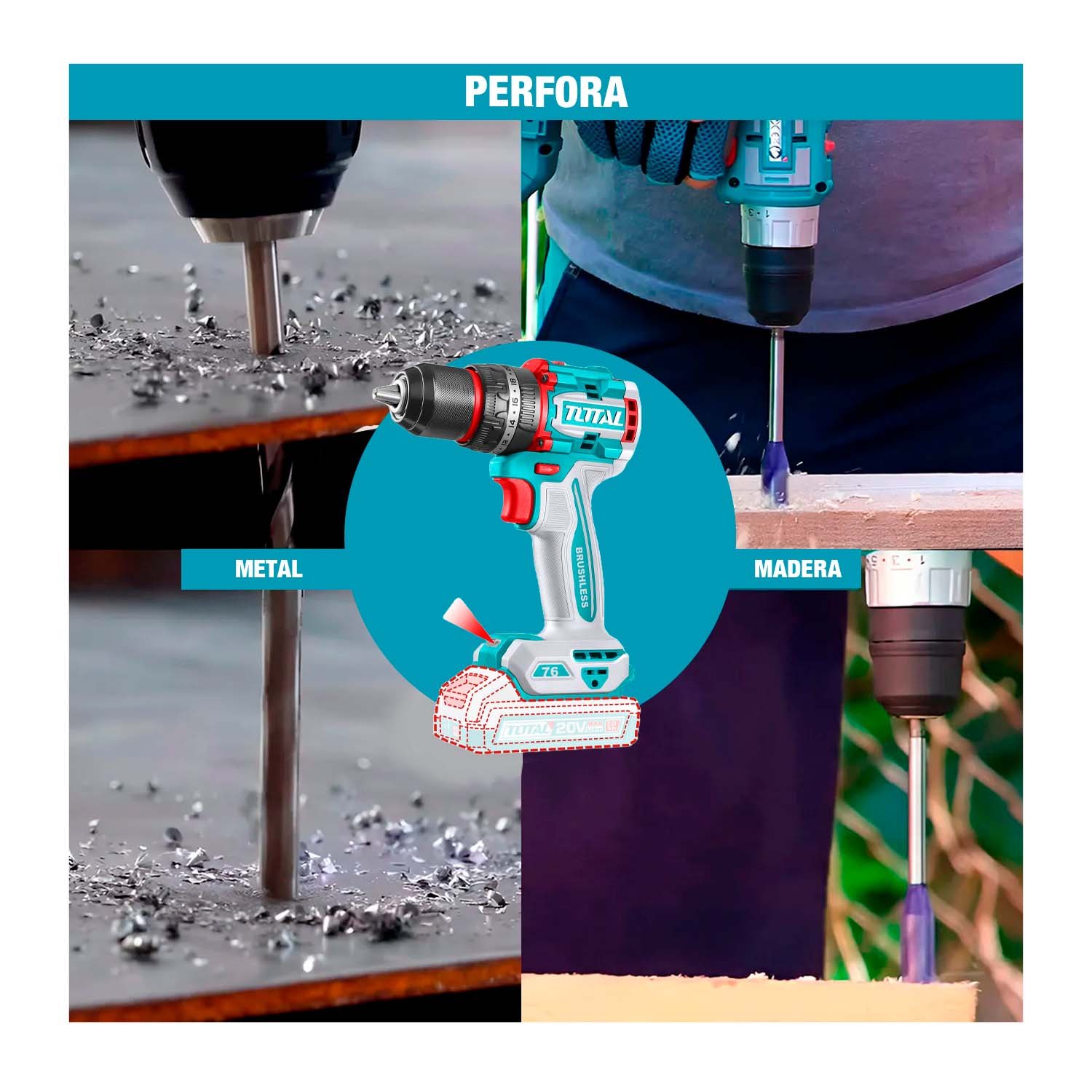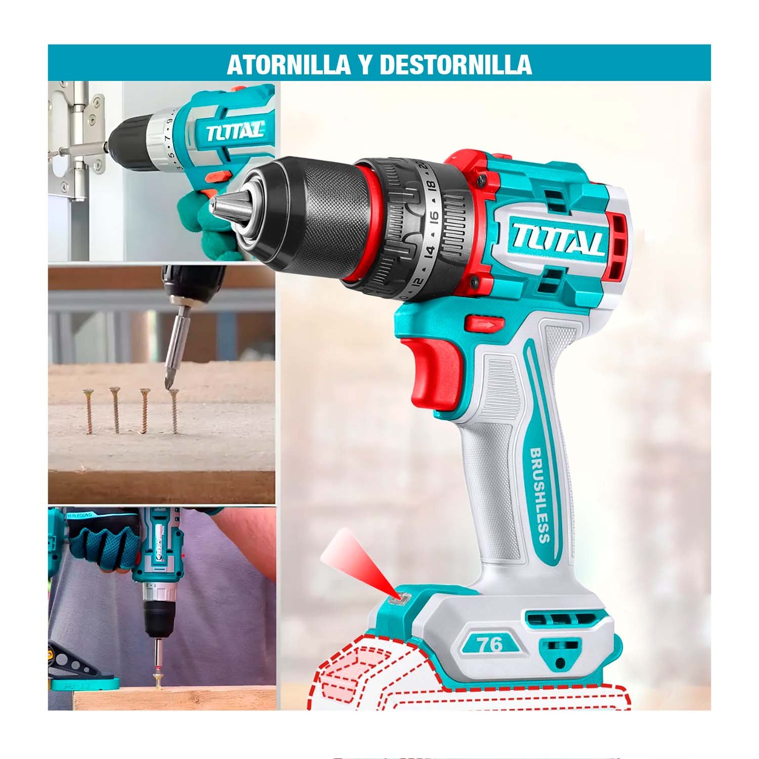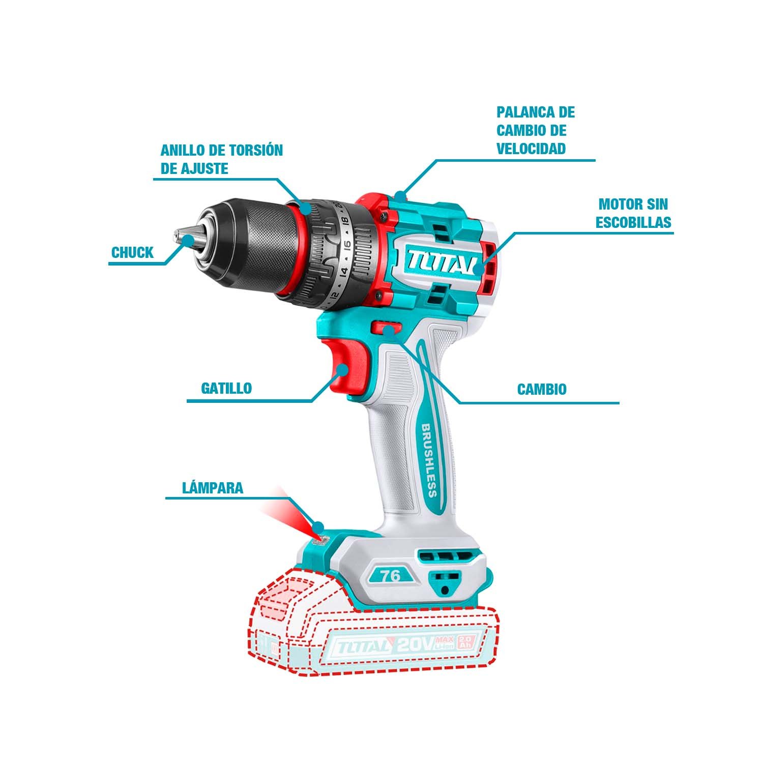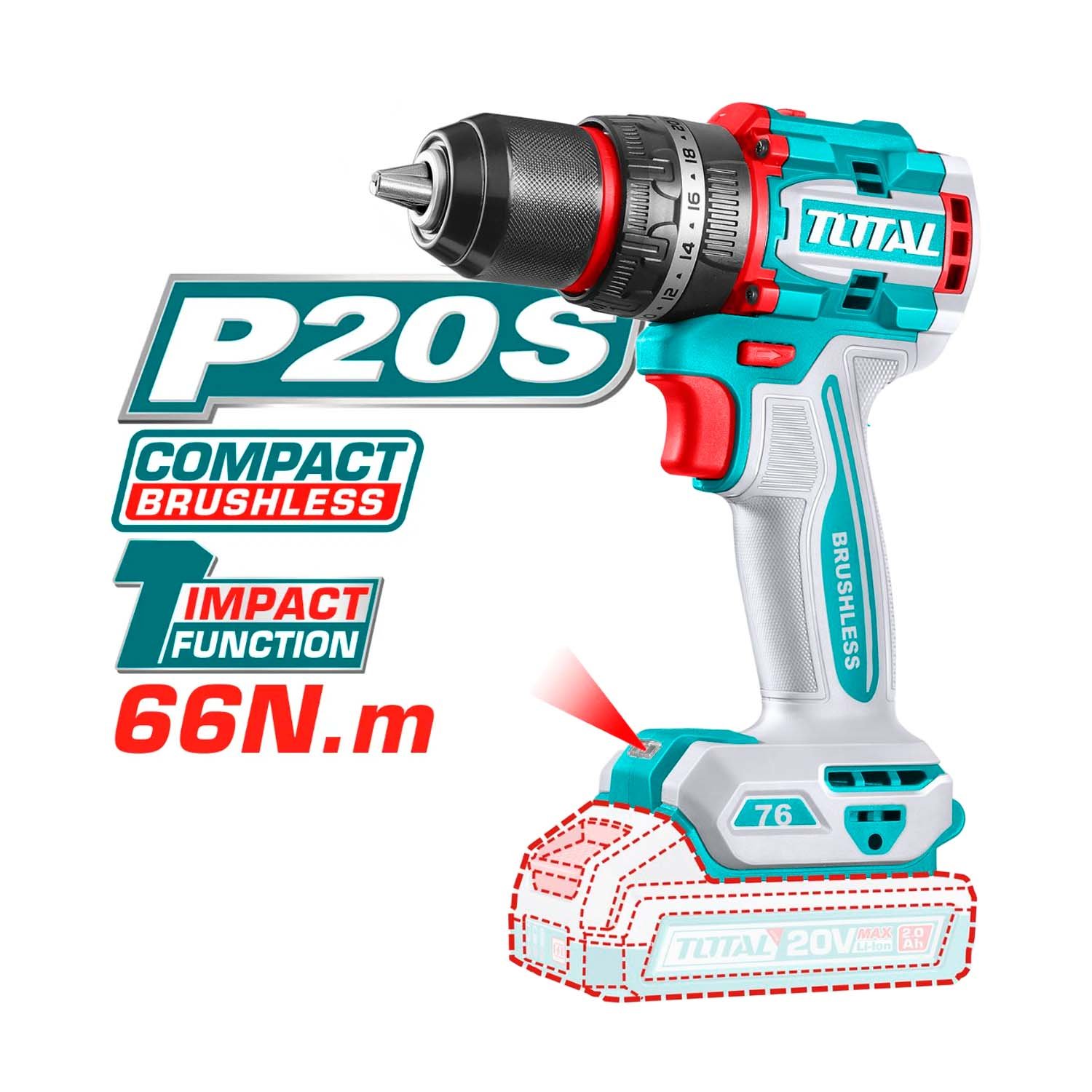 TALADRO PERCUTOR 76NM 20V BRUSHLESS 13MM TOTAL TIDLI20768