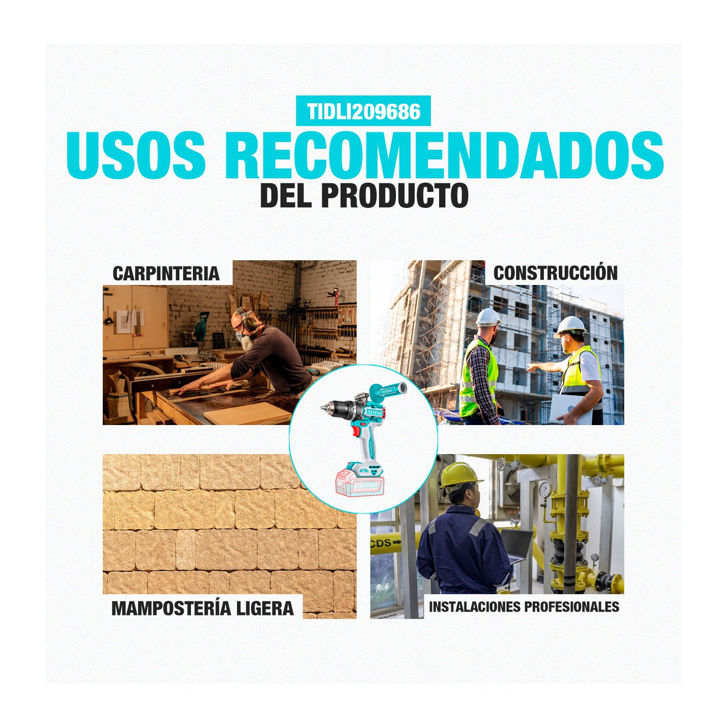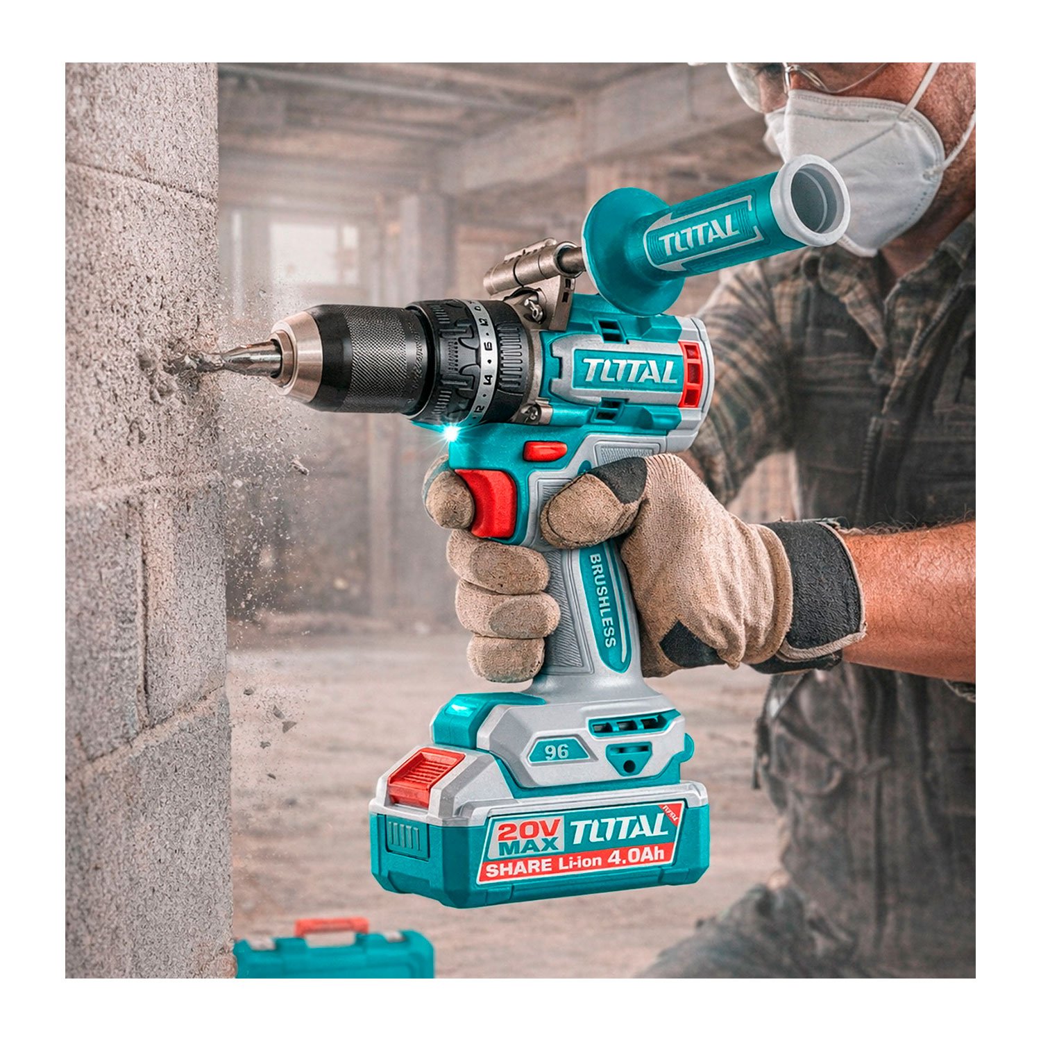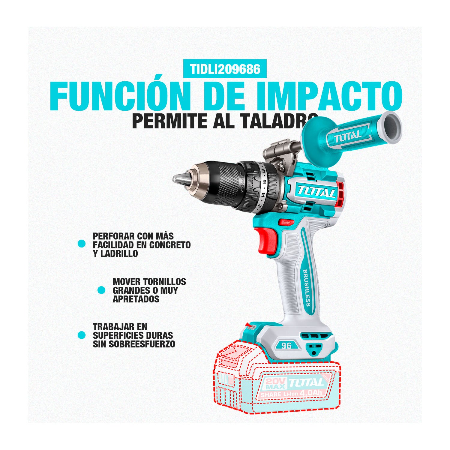 El taladro atornillador inalámbrico TOTAL TIDLI209686 es una herramienta profesional de 20V equipada con motor Brushless (sin escobillas) que ofrece mayor potencia, eficiencia y durabilidad. Cuenta con función de impacto, alto torque de hasta 96 N·m, mandril metálico de 13 mm, dos velocidades mecánicas y control de torque para un trabajo preciso en madera, metal y mampostería ligera. Incorpora indicador de carga de batería, luz LED para zonas de poca iluminación y un diseño ergonómico que reduce la fatiga. Incluye dos baterías de 4.0Ah, cargador y maletín, siendo ideal para trabajos exigentes en obra, taller o instalaciones profesionales