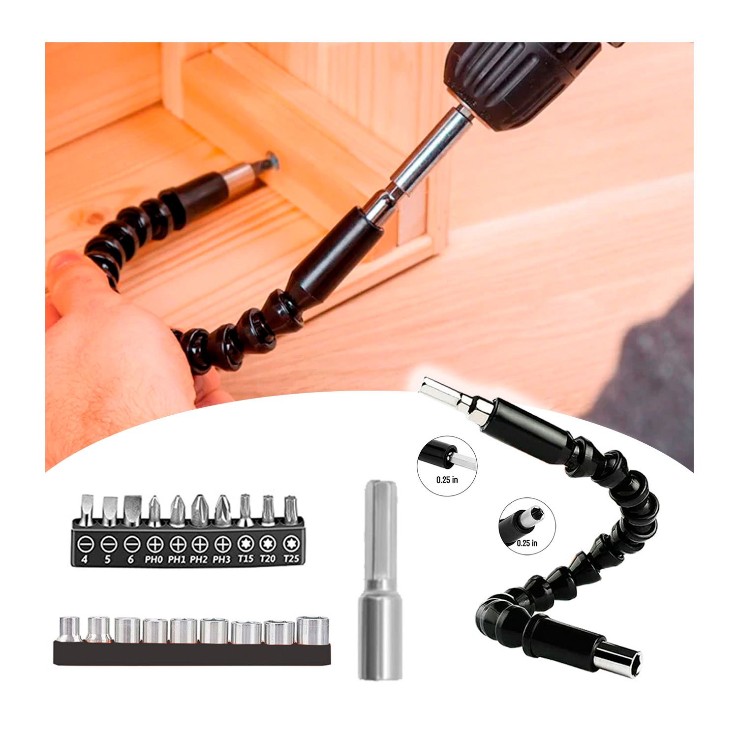 • 1 Eje flexible Universal (hexagonal), utilizado para Portabrocas de mano tipo eje cardán y destornillador eléctrico.