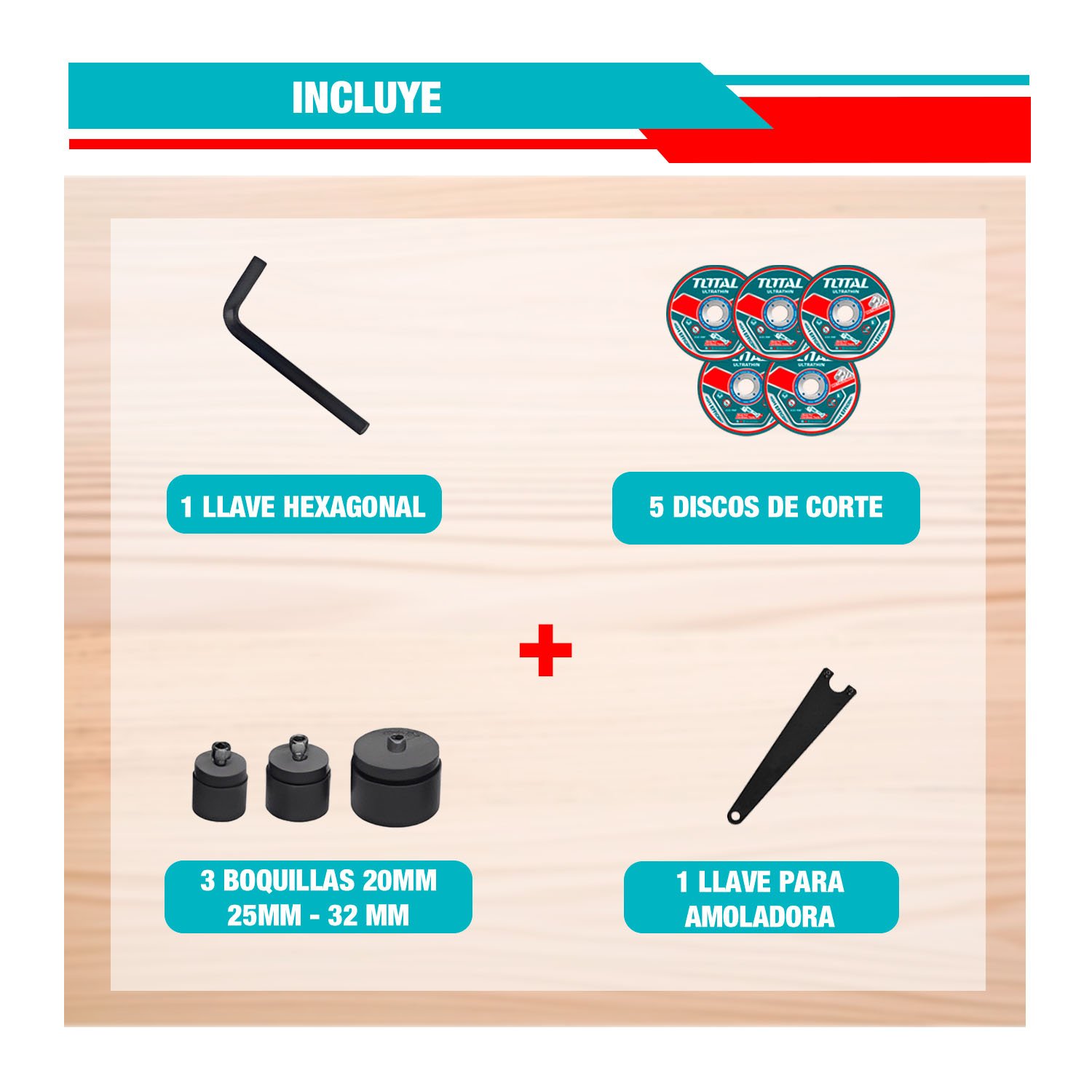 ESTE COMBO COMPLETO INCLUYE;1 TERMOFUSOR; 1 AMOLADORA; 1 BATERÍA; 1 CARGADOR; 3 CABEZALES;1 LLAVE HEXAGONAL; 5 DISCOS.